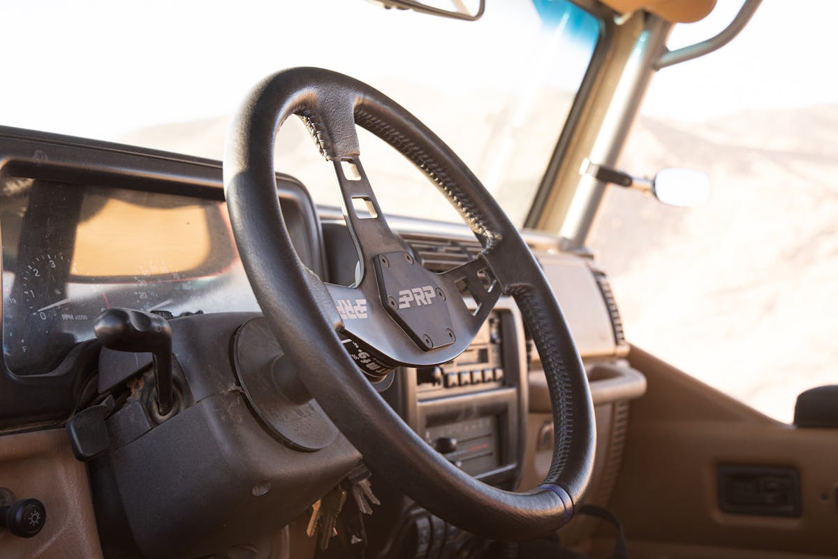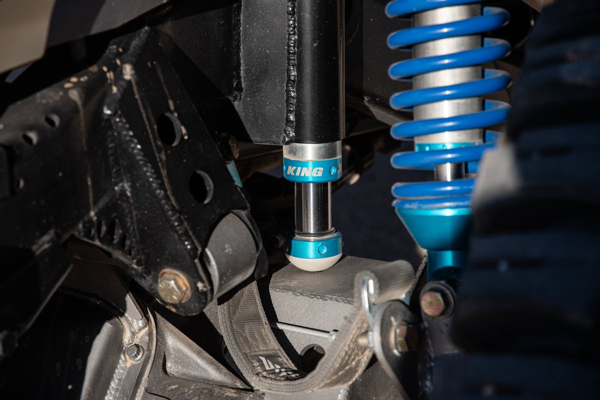 Currie RockJock axles keep the rubber turning in the harshest conditions. King bump stops and limit straps keep the suspension within its limits on either side. PRP handled most of the interior upgrades in the form of seats and this quick-disconnect steering wheel.