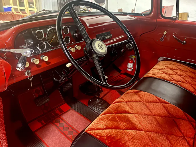 Jay’s truck is still outfitted with its original body, but it has been sealed in six coats of Ford-spec red paint. Inside, the truck retains its factory equipment but features a reupholstered bench seat and a Motorola AM/FM/eight-track stereo system, among other things.