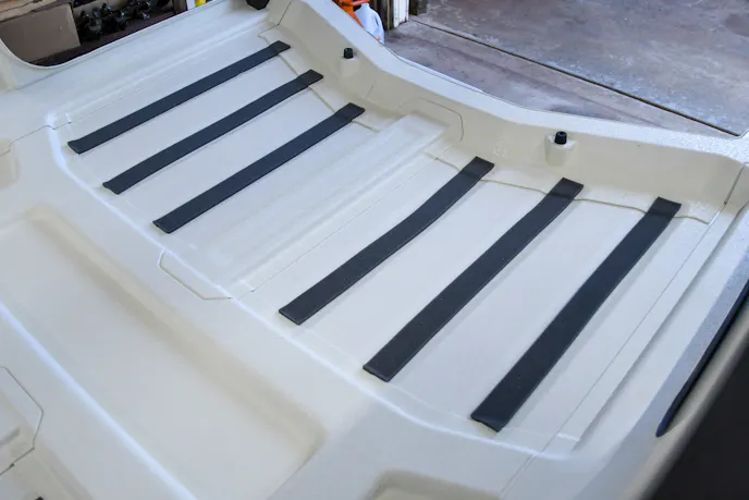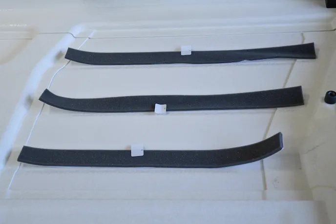 To minimize the appearance of the recessed molded ribs on the hardtop surface, install the foam filler strips provided in the kit. These strips vary in length, width, and thickness, so test-fit them in each location before adhering them.