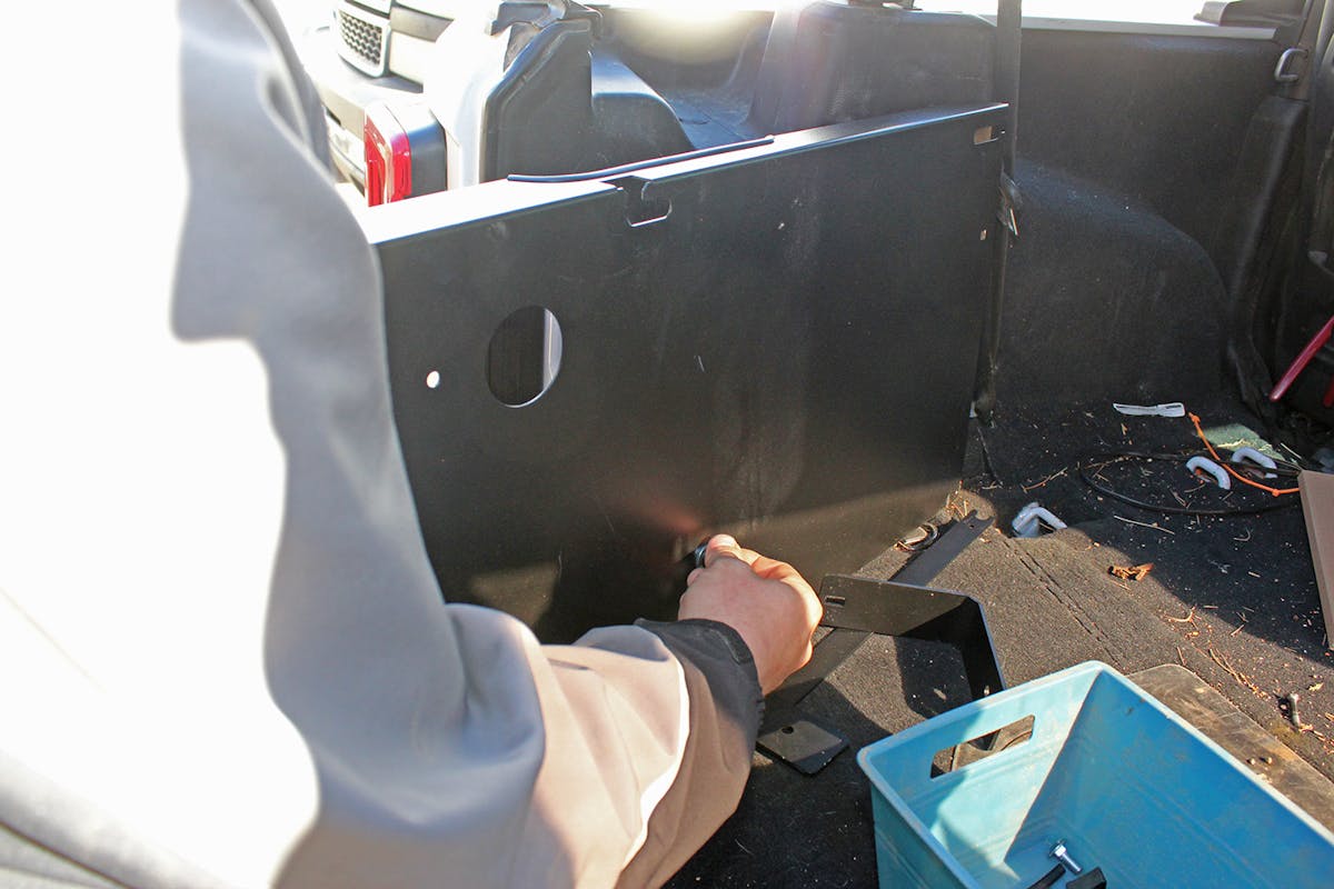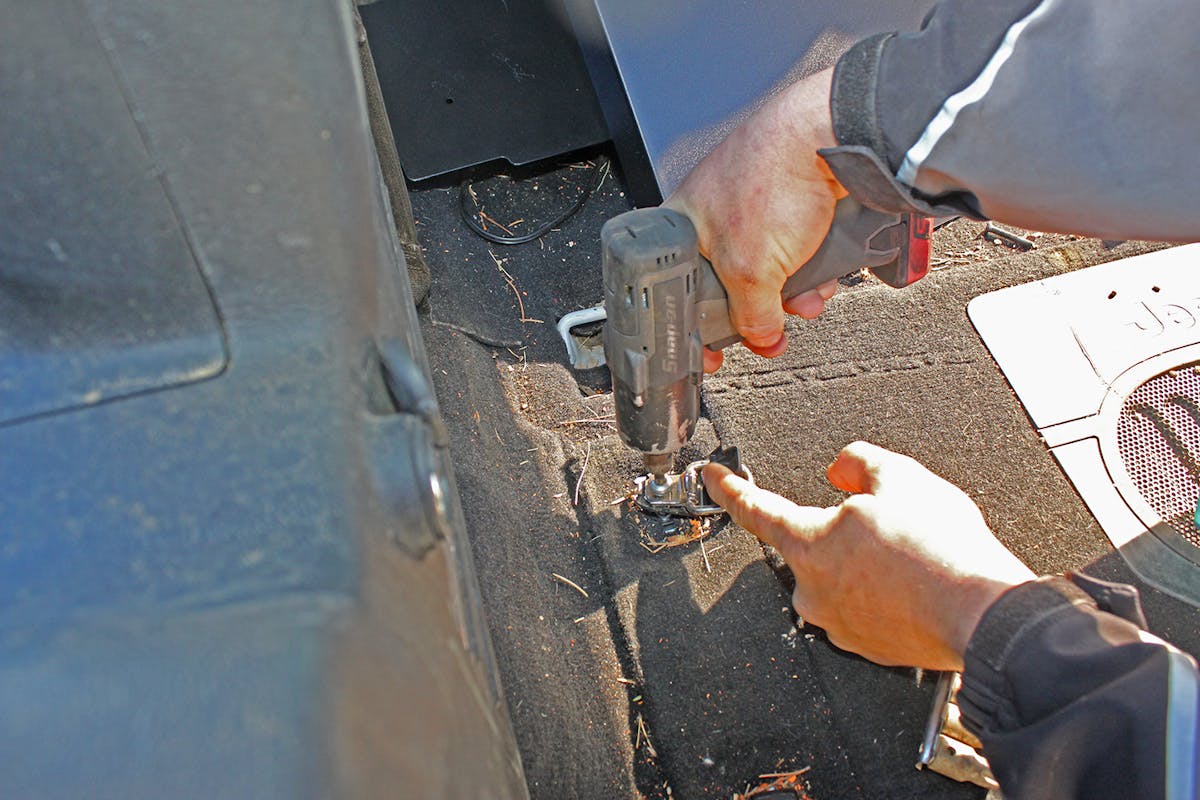 - The rearward cargo loop must be removed and the L-bracket securing each side of the Enclosure is attached to the captured nut in the Jeep’s floorboard.