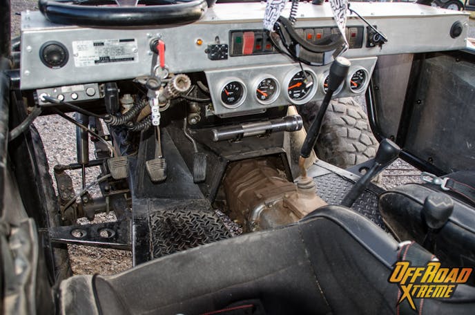 From the front seats, Jim has an unobstructed view of the front tires. This helps him put the tires exactly where they need to be while crawling over rocks. The five-speed transmission and dual Toyota transfer case shifters are within easy reach. The rear case uses a 4.7:1 low-range gear set which gives an approximate overall crawl ratio of 240:1! The dash is simple with a row of switches and a few Auto Meter gauges to monitor the vitals. Jim used a Monster Harness built by Offroad Solutions to wire the dash, engine, and accessories.