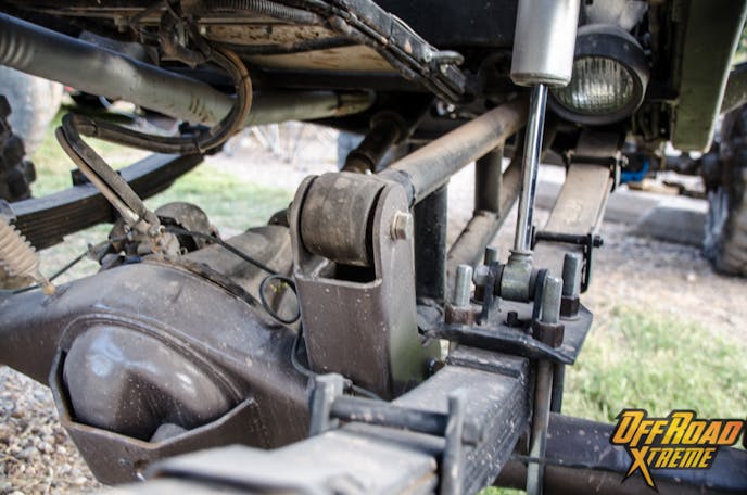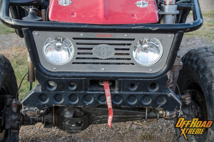 Once Jim received his rolling chassis, he got to work installing all the parts he had accumulated for the build. The engine was pushed back in the chassis allowing for better weight distribution. Hiding behind the custom-made grille in the space formerly occupied by the radiator and engine is a Warn 6,000-pound winch. The front crossmember is built lightweight with dimples for additional strength. It also serves as the mount for the front leaf springs.