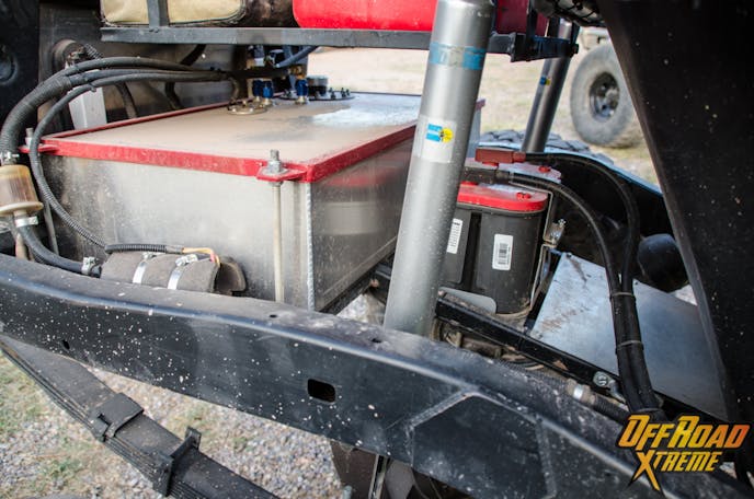 In the rear of the F-Toy is a 17 gallon RCI aluminum fuel cell with an external E2000 fuel pump and Optima RedTop battery mounted down low to help with the center of gravity and weight distribution in the chassis. Above the fuel cell and battery is a gear rack that provides a secure location to tie down the cooler and tools. Out back, 14-inch travel Bilstein shocks are also used for dampening duties.