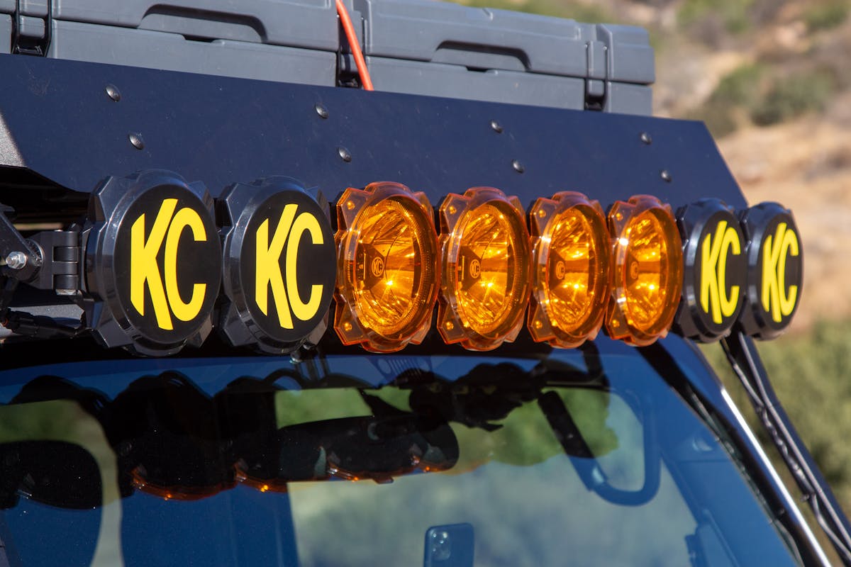 For lighting, Richie went with KC HiLiTES. The front of the Garvin rack holds an array of Pro 6 lights facing forward, while underneath the windshield are Dual Flex pod lights. Underneath the Jeep, Richie installed several KC Cyclone lights as rock lights. All of them (as well as the winch) are controlled in the cabin using an sPOD system with switch panels overhead and next to the steering wheel.