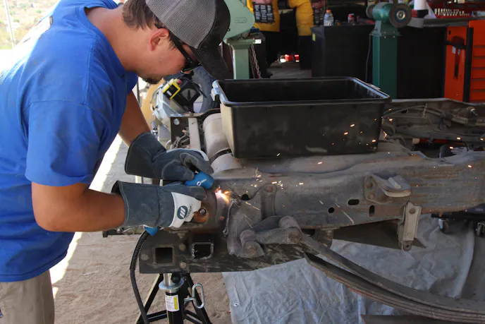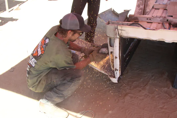 Team Damage Inc was already fabricating on their truck, foreshadowing the sizable time advantage they would gain on the other teams. Rylee Walker had his welding mask on and was mig welding the shock towers to the frame. Meanwhile, Tyler was still knocking out bits of metal on the frame’s rear. “All I’ve been doing all day is plasma cutting,” he blurted. “It feels like there are 400 rivets all over this truck, and I need to plasma-cut all of them to get rid of the brackets.”