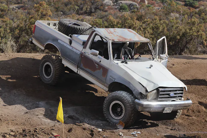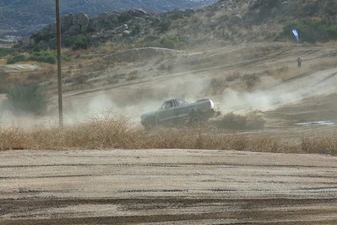 About one second, actually. Coming into the first turn, Jeff and Rylee were going at it. Rylee pulled ahead coming into the third turn, but Jeff was hot on his tail. The grizzled veteran rock racer versus the master fabricator, GMC versus Ford, NorCal versus SoCal – the significance of this rivalry was too enthralling to take our eyes away. Meanwhile, Tyler resigned himself to fourth place until the mandatory caution came. Dez did his best to keep up.
