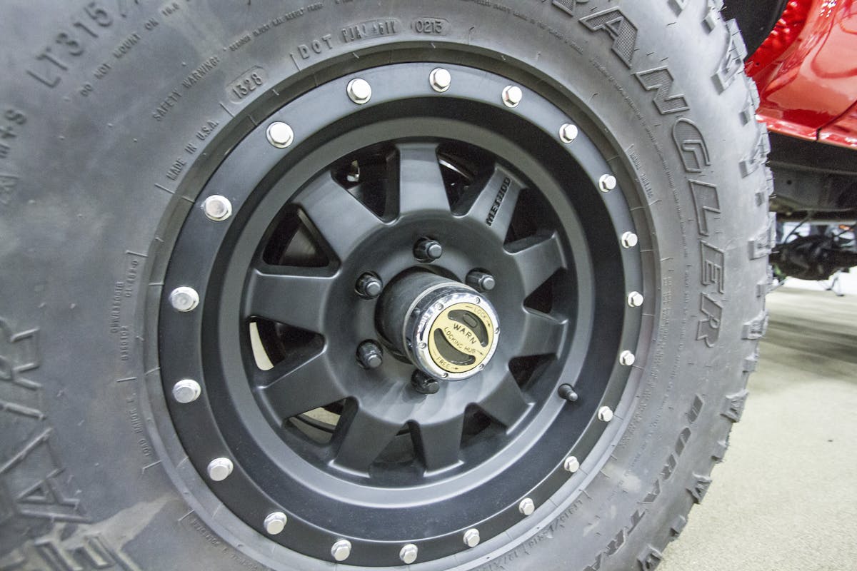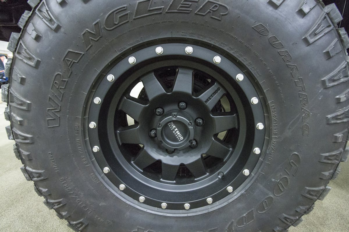 Method wheels and 35-inch Goodyear Wrangler A/T tires fill the space of the stock wheels and tires.