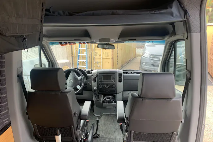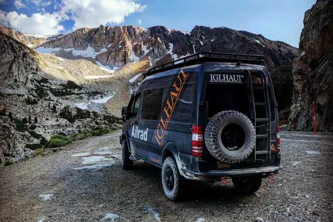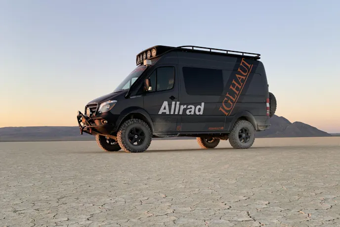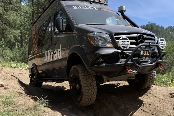 The van only has 34000 miles on the odometer and comes equipped with three locking differentials. The off-roader rides on a set of 18-inch alloy wheels, which are wrapped in 37-inch BFGoodrich MT3 tires. A 4.75-inch suspension lift helps accommodate the larger wheels of the Sprinter 2500 IGLHAUT Allrad 4X4.
