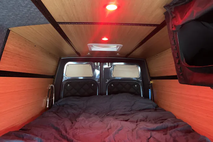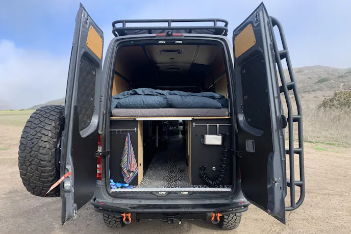 Exterior modifications include a rear door ladder, a roof rack, side steps, a receiver hitch, and a winch. We find amenities like a foldaway bed, refrigerator, complete bamboo Adventure Wagon interior kit, and Scheel-Mann seats with black upholstery inside the van. The van comes with a clean California title and a clean Carfax report.