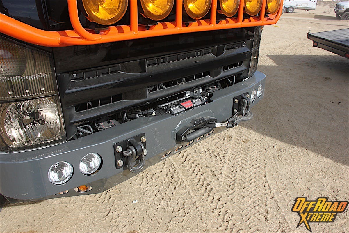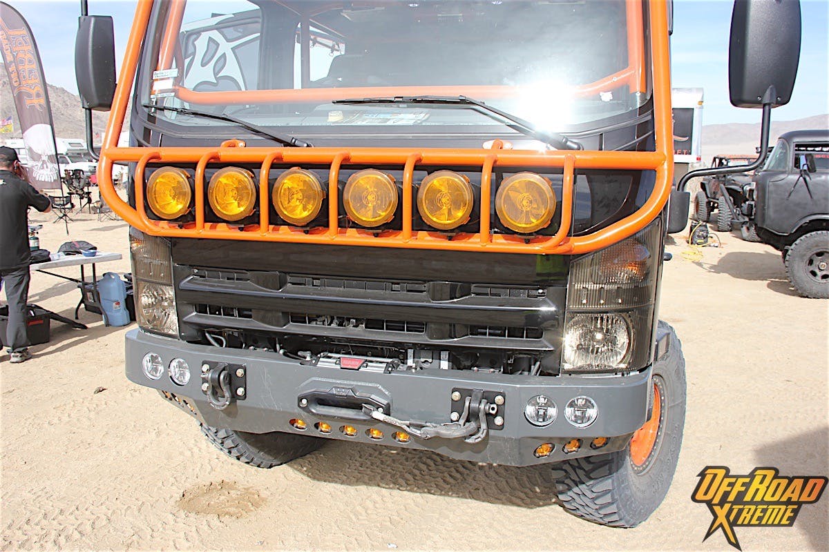 “The cab and chassis are from an Isuzu NPR,” he said (Isuzu actually calls it the “Elf,”; Chevrolet sells it as the NPR to international markets). “Everything else is just build around that. It’s got a six-liter Chevy motor inside of it. All of the suspension is full-blown, trophy-truck-level components – trailing arms, 3.0-inch coilovers, 2.5-inch triple bypasses, hydraulic bump stops on all four corners. We went massively overboard on this one.”