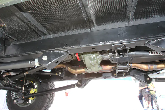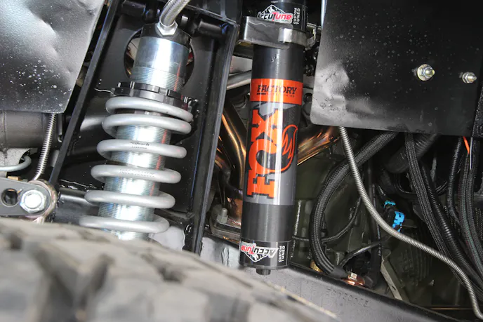 Up front is a three-link design and out back is a four-link setup. Each lower link is made from 2-inch-diameter DOM tubing, and the upper links are made from 1.5-inch-diameter DOM tubing. Each lower link is fitted with Barnes 4WD 1.250-inch chromoly Heim joints and the uppers use 0.875-inch Barnes 4WD chromoly Heim joints. The front coilovers are Fox 2.0 remote-reservoir units with 10 inches of travel, while out back reside Fox 2.0 remote-reservoir coilovers with 12 inches of travel. Finally, Fox 2.0 bump stops are used front and rear as are Rock Jock Antirock sway bars.