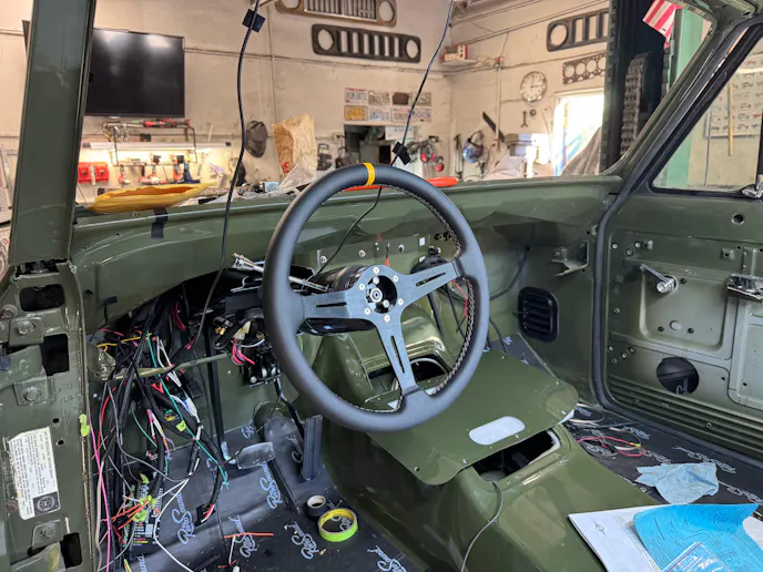 Inside, the Scout packs a long list of upgrades. Front passengers ride in Procar Elite seats on DVF brackets, while the rear passengers sit on a factory Scout bench. RetroBelt three-point belts keep everyone secure, and a DVF 5-Point Rallye Cage adds extra protection. Other interior highlights include a modified Tuffy Products console, a Nardi steering wheel, and a Focal/RetroSound audio system. There’s also a Wolfbox rearview mirror with front and rear cameras to boost visibility. DVF created the custom carpet, and it can be pulled out for quick washdown, a nod to David’s 25 years of off-road experience.