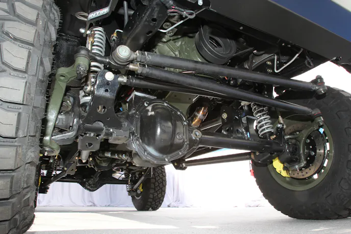Each factory Dana 44 axle runs a Yukon Gear & Axle Dura Grip limited-slip differential and USA Standard Gear 4.10:1 gears. The front axle sports Mile Marker manual hubs, and the rear is upgraded with Dutchman Axles chromoly axleshafts. Power moves from the transfer case to the axles through 1310-series double-cardan driveshafts.