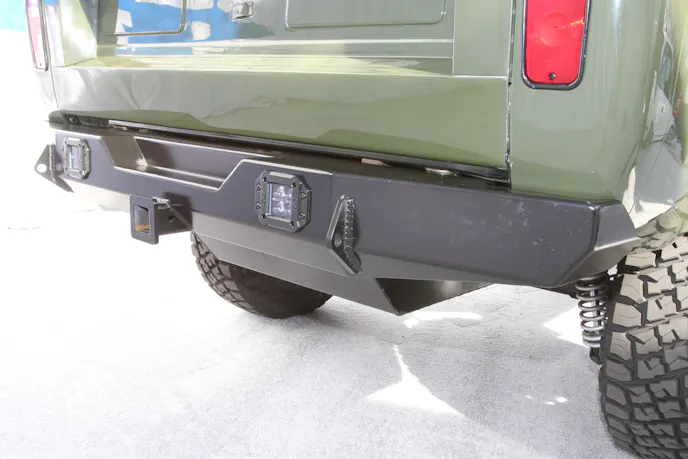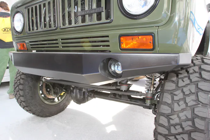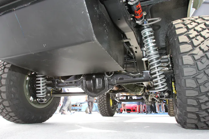 Up front is a three-link design and out back is a four-link setup. Each lower link is made from 2-inch-diameter DOM tubing, and the upper links are made from 1.5-inch-diameter DOM tubing. Each lower link is fitted with Barnes 4WD 1.250-inch chromoly Heim joints and the uppers use 0.875-inch Barnes 4WD chromoly Heim joints. The front coilovers are Fox 2.0 remote-reservoir units with 10 inches of travel, while out back reside Fox 2.0 remote-reservoir coilovers with 12 inches of travel. Finally, Fox 2.0 bump stops are used front and rear as are Rock Jock Antirock sway bars.