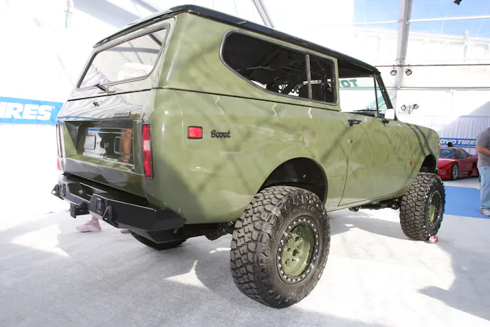 The added suspension height gives the LT285/70R17 Toyo Open Country R/T Pro tires plenty of room to cycle in the wheelwells. Each 9-inch-wide KMC KM235 Grenade Crawl beadlock wheel is painted to match the Scout’s body color.