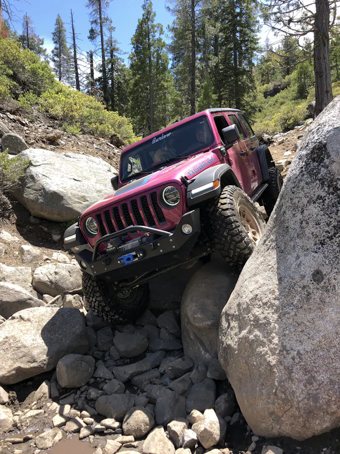 Second, the hybrid Jeep Wrangler 4xe Rubicons are not as smooth in the big rocks as the other drivetrains we have had. That’s not to say that we won’t take them on trails like, say, the famous and challenging Rubicon Trail (we do), but it’s not going to be the smoothest choice, especially for a novice driver. Although a very small percentage of drivers will ever find themselves in the size of boulders I’m talking about, the 4xe gets a little lurchy when you are trying to finesse the throttle over boulders taller than the wheels.