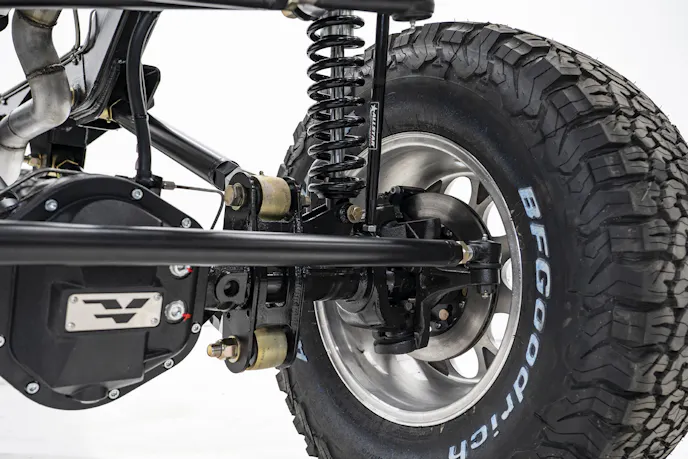 Up front is a Dana 44 axle with Warn Premium manual hubs. Out back, a Dana 60 houses a limited-slip differential. Each axle has 3.73 gears. To rein in forward velocity, each axle has 11-inch Wilwood disc brake rotors and four-piston calipers. Furthermore, the braking system also includes an iBooster vacuum-independent, electromechanical brake booster. Finally, there are no leaf springs under this K5. Instead, the SUV is fitted with a stout RockJock 4×4 Johnny Joint-equipped four-link system and Fox 2.5 coilover shocks.