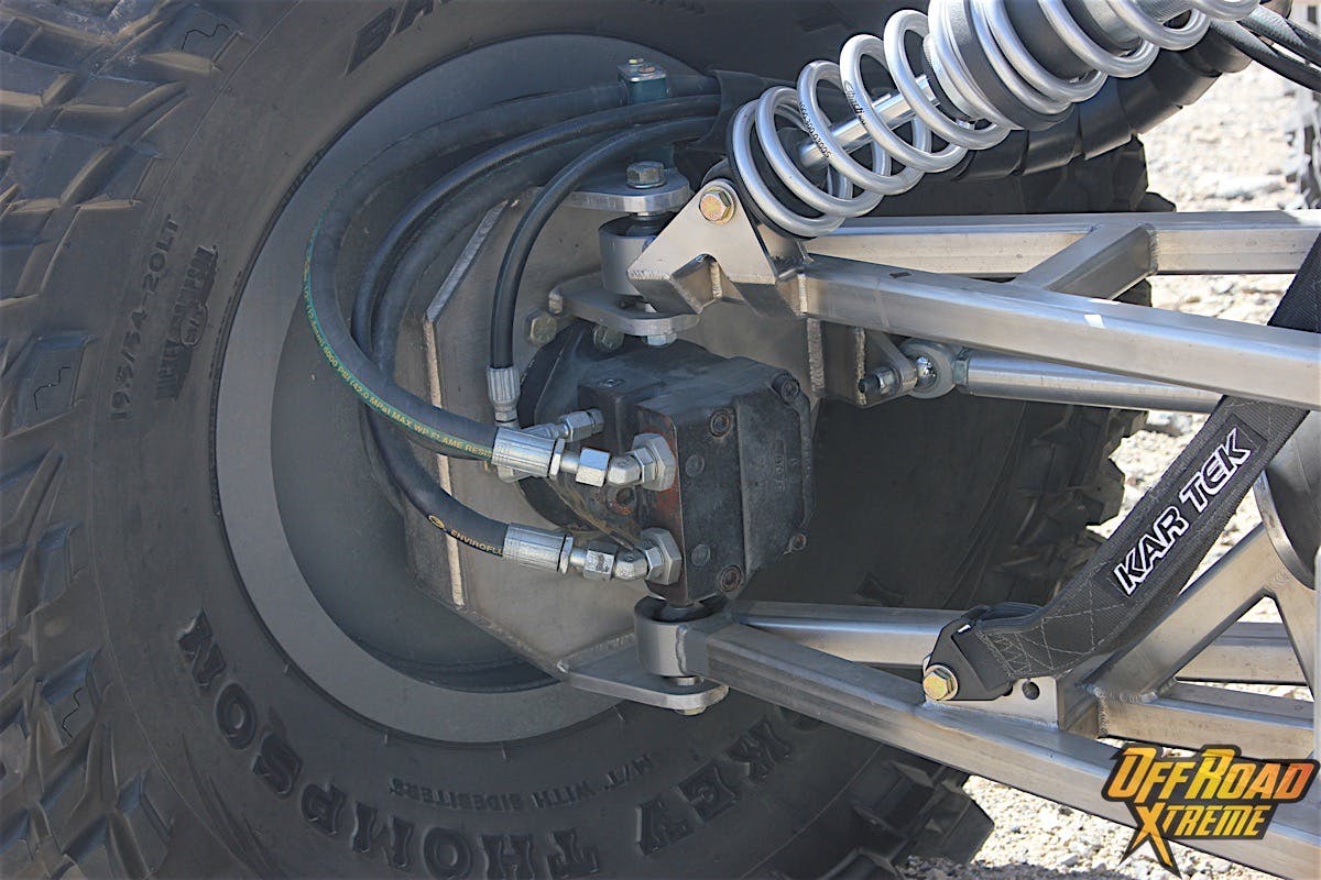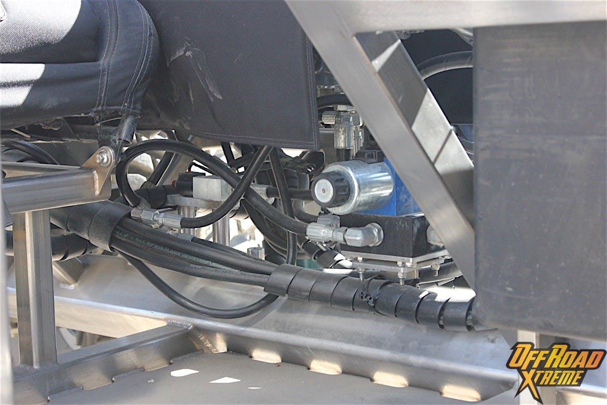 The buggy’s LS3, which is connected to a driveline, is hooked into a central oil pump. From there, oil is pumped through high-pressure lines to motors at each of the four wheels, where pistons are arranged in a circle and rotate up to 4,000 rpm. The pistons are very small – one-inch stroke, three-quarter-inch piston diameter – but they’re remarkably reliable, as are the lines which channel the oil. In all, Jeff estimated there was between two to three gallons of oil circulating through the buggy to make it work.