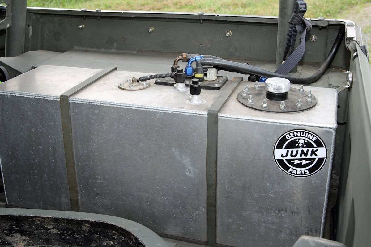 Inside, features include upgraded gauges, a modified factory rollcage, and aftermarket levers for the transmission, crawl box, and transfer case. There’s also an upgraded audio system, a cargo-area-mounted aluminum fuel cell, and aftermarket seats.