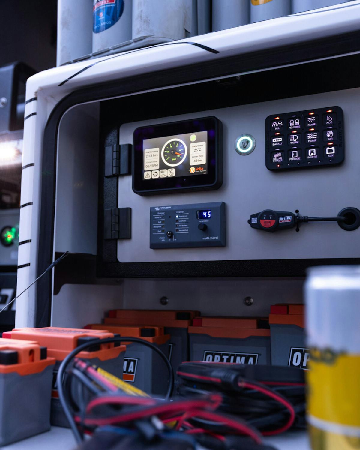 Each custom Turtleback Trailer serves a special purpose. The Utility Turtle carries two CAKE Kalk OR Race electric motorcycles and storage for adventure gear. The Kitchen Turtle has an overland kitchen unit with an electric stove, sink with running hot and cold water, and a 45-gallon water tank. A main control center has a display that shows a variety of information such as how many hours are remaining and the battery pack temperature. There’s also a Switch Pros unit that controls lighting among other things. EV charging is handled by a Wallbox level 2 charger. Each trailer is fitted with rugged and trail-proven LT295/65R20 (35-inch diameter) BFGoodrich All-Terrain T/A KO2 tires. These tires are wrapped around custom Black Rhino Alston forged wheels. Furthermore, trailer paint is protected by 3M Scotchgard Paint Protection Film Pro Series Matte. The paint protection film was installed by Star Shield Solutions.