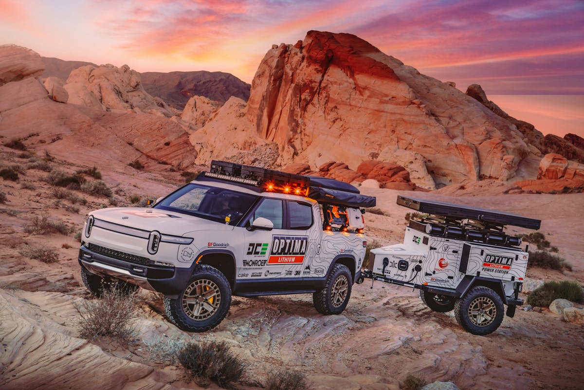 OPTIMA Batteries modified its Rivian R1S and R1T for overlanding. The plan: Take the all-electric vehicles to off-road and racing events. The challenge, however, is that many times these events are far away from modern amenities. You know, amenities like electricity. This means it’s not an option to pop into a DC fast charging station prior to the return trip. Or even a level 1 or level 2 charger for that matter. To ensure that OPTIMA could drive its pair of Rivians out to the wilderness, and back, it engineered an impressive solution called the OPTIMA Power Station. The company has two of these solar-powered trailers and each is so powerful it can recharge a Rivian’s battery.
