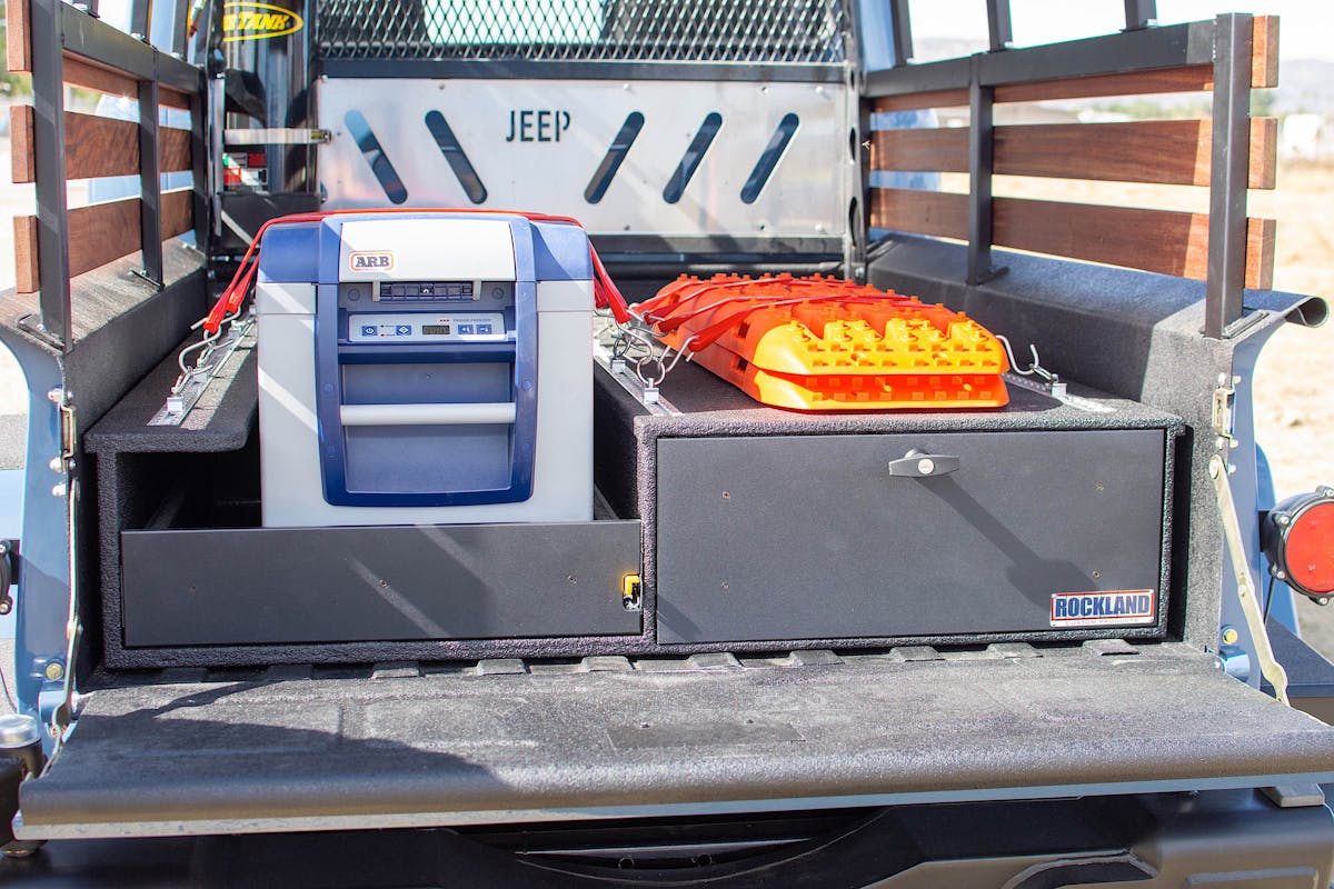 Out back on the rear rack is a Power Tank nestled in the bed along with storage cabinetry from Rockland Custom Products allowing easy access to the cooler and storage compartments. On top of the rack is a Hi Tents Jalama that will give Wallace a place to rest after a long day on the trail.