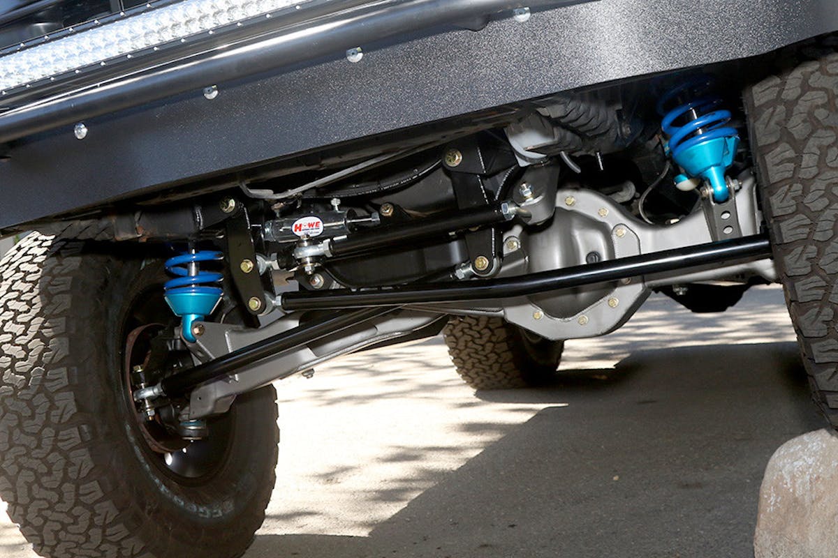 Since you are converting the rear suspension to a linked design, you will have to modify the rear axle housing. There is no sense in using the factory housing, axles, or differential. Any gusseting or link mounts that you would add to a stock housing would rip right off because the axle tubes are too thin. You need something you can weld to and that will stand up to the pounding. You will need some type of locking rear diff, or a fully locked spool. Of course, with all of the additional clearance you have after removing what was left of your factory bed, you can now mount larger tires that will require bigger brakes all around, as well as a gearing change.