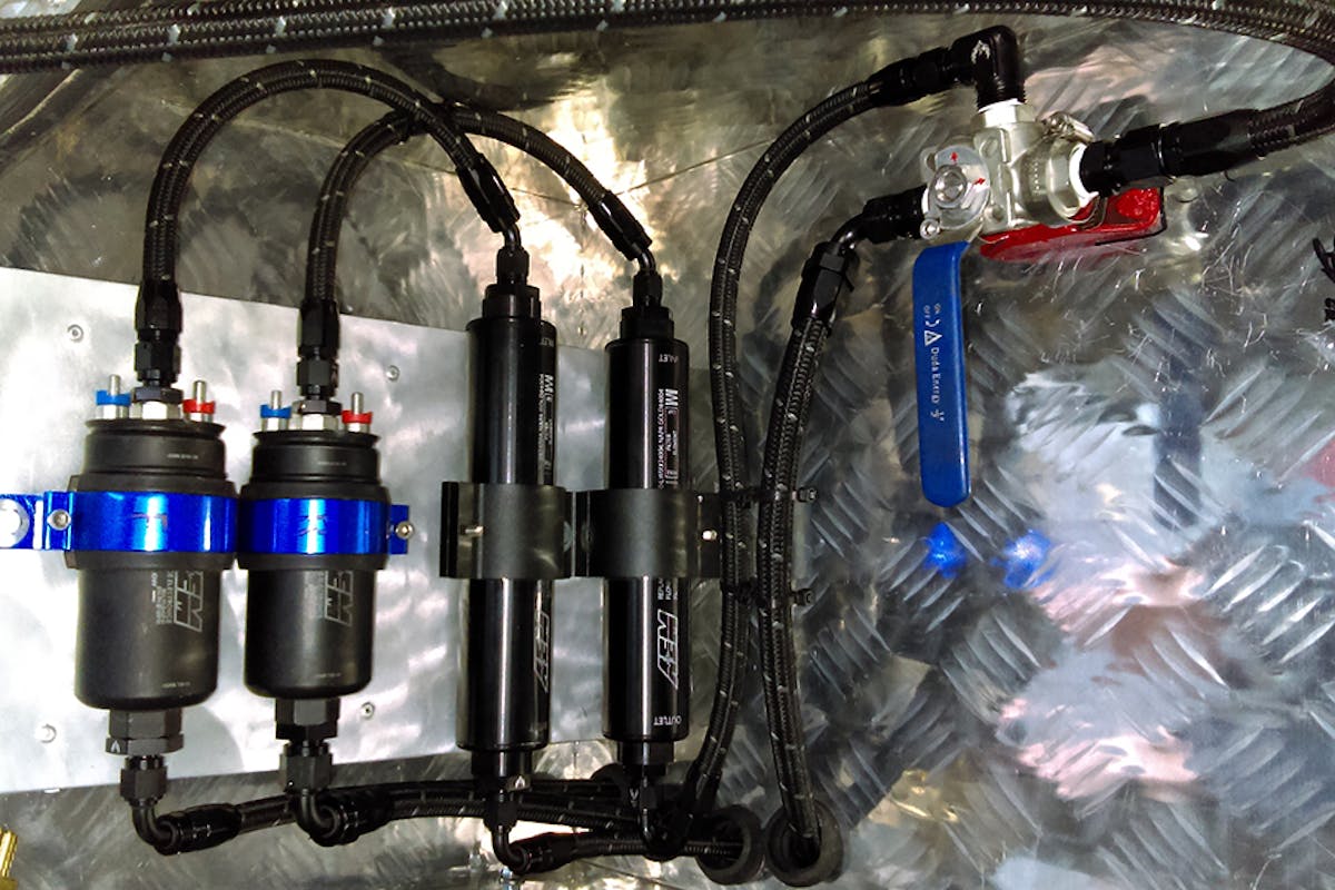 Once you are this far down the road, you might as well go all out. If you are still running leaf springs in the rear, they are now holding you back. It’s time to go with a linked rear suspension. That requires more frame bracing, and a revision to the bed cage. In order to make room for the links and new shock mounts, you will probably end up cutting the frame off and redoing the entire rear half of the truck. And now that you have cut your truck in half, you’d better have a good fab shop or be skilled enough yourself to put it back together right. It’s also the the time to design a fuel cell and the pumps, rollover valve, and filters that go with it. Oh, and did your budget include plumbing, coolers, wiring, and hardware? Because it ought to.