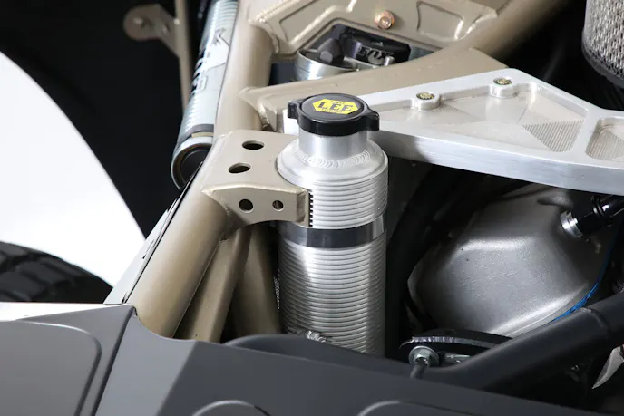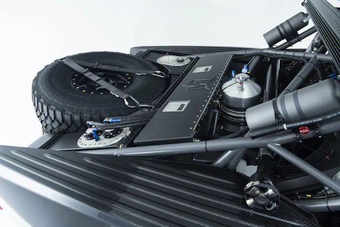 “These are basically a tube frame Trophy Truck with a high horsepower motor, and gobs of suspension travel. Almost thirty inches in the front and over thirty inches in the back. The trucks have incredible ride quality because the occupants will spend many hours inside. We use premium leather throughout, and equip air conditioning, sat phones, and GPS. I think we were the first to install a compact fridge in a Luxury PreRunner too.”