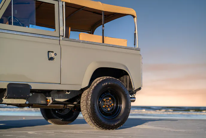 That philosophy is evident throughout the build. From the galvanized OEM-style bumpers to the Surrey canvas extended bikini top finished in sand, every component serves a functional purpose. This is not a museum piece. It’s a classic reengineered to handle modern roads, trails, and expectations without pretending to be something it isn’t.