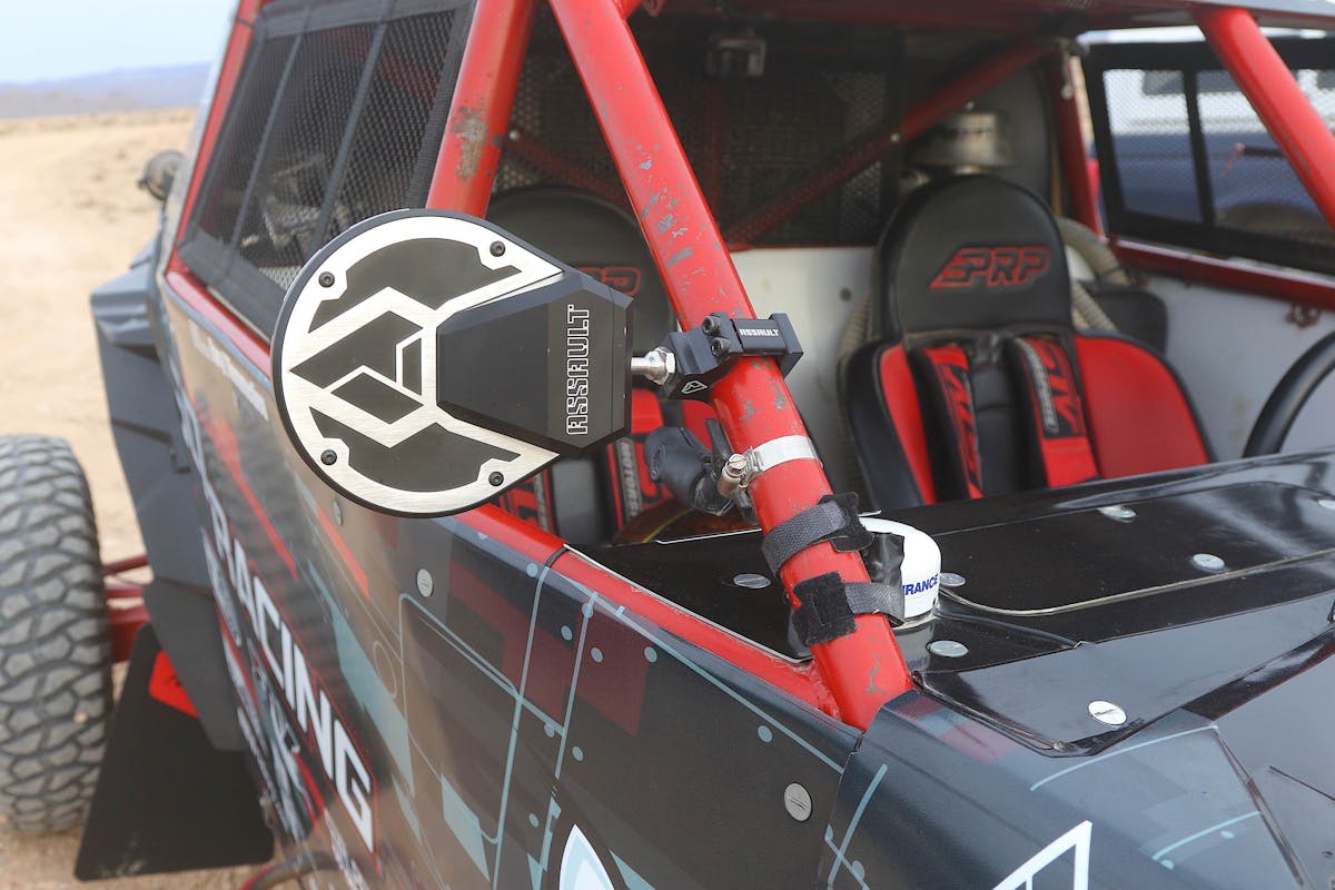 A GoPro housing is mounted to the roof to capture the action behind. Multiple LED light bars face rearward and an S&B fine particle separator supplies filtered air to the Turbocharged 1000 cc Polaris engine that is controlled by AEM electronics (left). GMZ 32x9.50-15 Ivan “Ironman” Stewart tires are wrapped around GMZ beadlock wheels on both cars (center). An axle shaft is mounted to the rear cage; one of the spares carried in case repairs are needed (right).