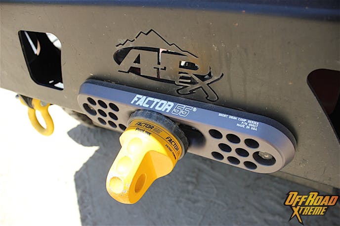 The front APEX bumper from All-Pro Off Road houses a Factor 55 fairlead and a WARN 9000 winch.