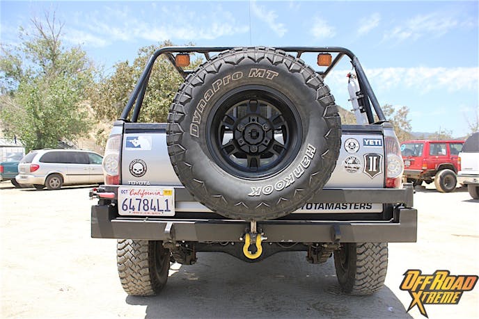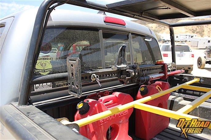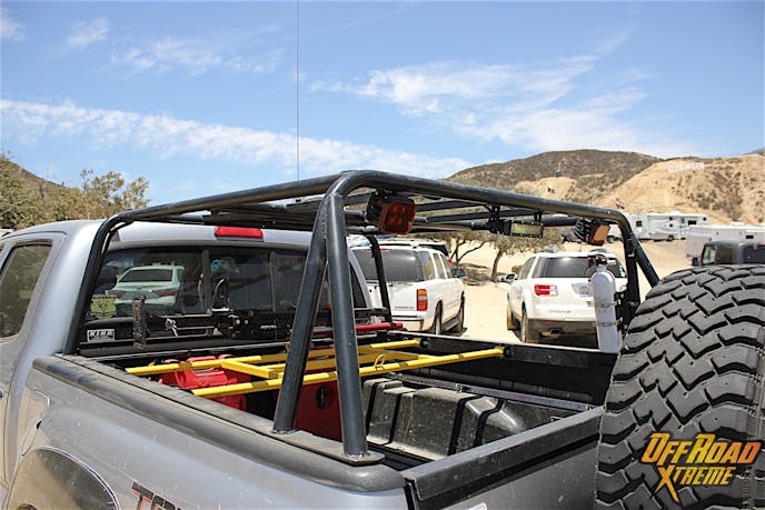 The back of the Tacoma is where we saw Chris’ ingenuity. He used his own custom-made rack and bumper/tire carrier to hold all kinds of essentials, from lights to fuel to fire safety equipment.