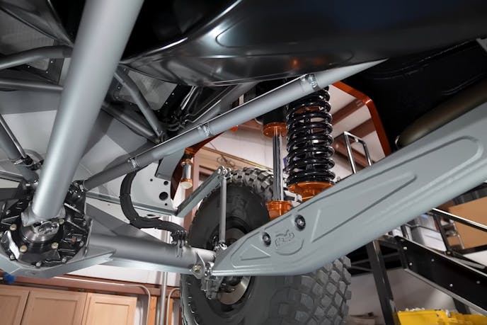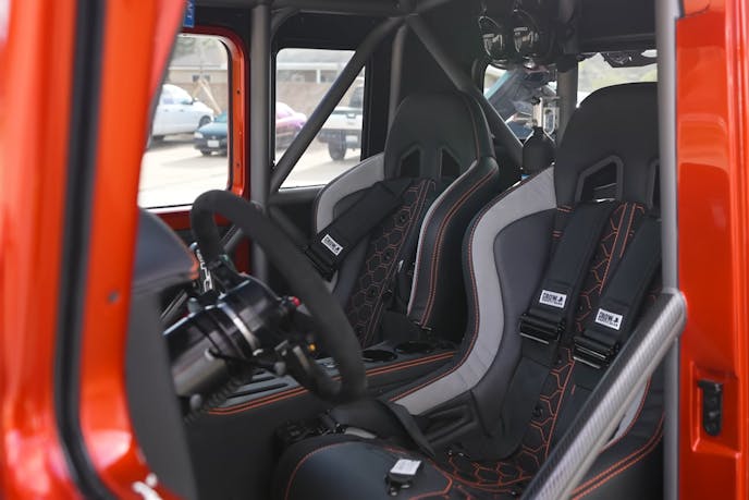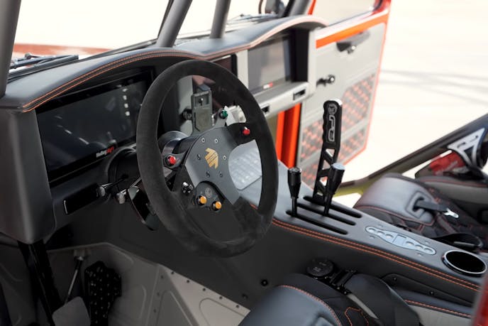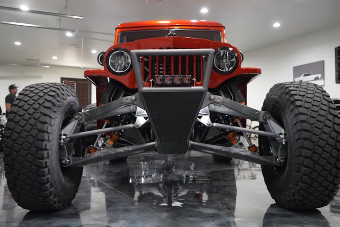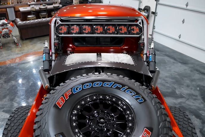 Out back, an RJ Fab custom four-link system delivers a massive 30 inches of travel, all controlled by King shocks. Powerful Jamar six-piston brakes handle stopping duties behind 17-inch beadlock wheels wrapped in 40-inch BFGoodrich tires.