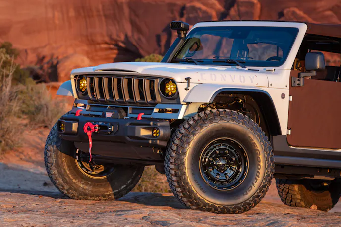 A military-inspired classic workhorse of a vehicle, the Jeep Convoy transforms a 2025 Gladiator Mojave into a truck that carries the legacy and heritage of the Jeep brand. The original Jeep Gladiator SJ was introduced for the 1963 model year and was the first post-war pickup designed for civilian use. Jeep trucks continued to evolve into the J-Series, which was in production through 1987. The Convoy concept emulates this iconic J-Series design with a its distinctive “J-truck nose,” which has proven over the years to be a fan favorite.