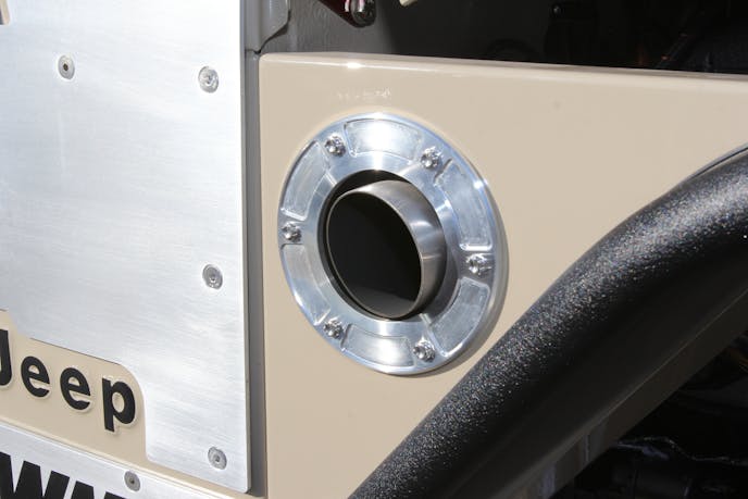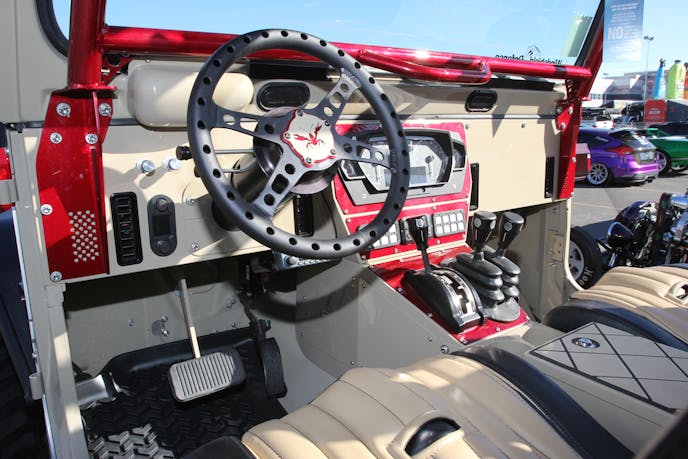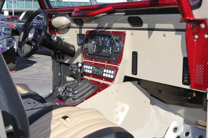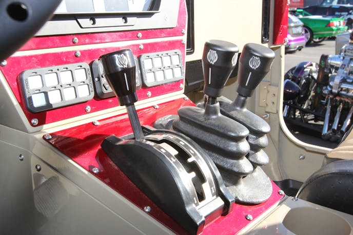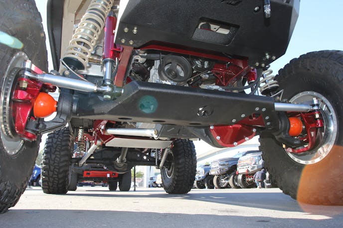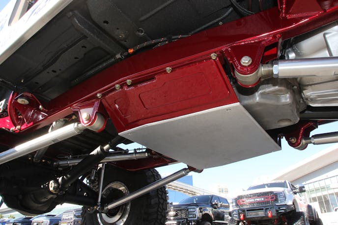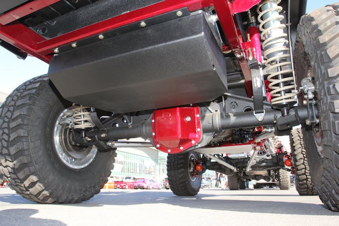Bolted to the engine is a 4L70E four-speed automatic with a 2,500 rpm stall converter. The transmission was upgraded to handle the LS’s output and is shifted through a Winters shifter. Power feeds into a 3.8:1 Advance Adapters Atlas 2 transfer case with an Advance Adapters twin-stick setup with Winters knobs. A custom 0.250-inch-thick 7075 aluminum skidplate protects the transmission and transfer case, and ‘shafts from Tom Wood’s Custom Driveshafts send power to the axles.