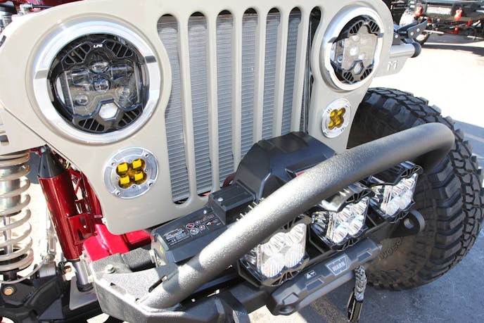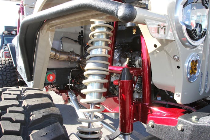 The Dana 60 front axle started life under a Ford Super Duty but has been heavily reworked for Scrambler duty. The long side was shortened and the short side lengthened so the centersection would clear the Jeep’s frame. The frame itself is a stock-width custom build using Throttle Down Kustoms rails for added strength. The front axle, moved six inches forward, runs Busted Knuckle Off Road high-steer knuckles that are custom machined and fitted with the company’s ball joint eliminators. It also packs RCV Performance Products 35-spline chromoly axleshafts, an Eaton Detroit Locker, and Revolution Gear & Axle 5.38:1 gears and diff cover. Steering is handled by a Radial Dynamics full hydro system with PSC Motorsports ram and billet Titan Machine & Design tie rods. A modified Artec Industries truss boosts axlehousing strength.