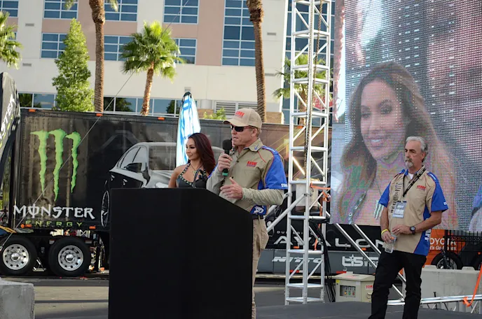 Some talking going on between Bryce Menzies and Pete Sohren, better known as “Pistol Pete,” at the SCORE experience at the SEMA Show