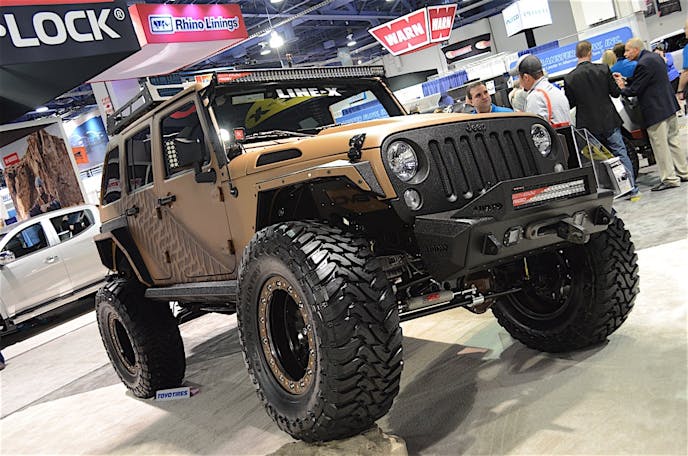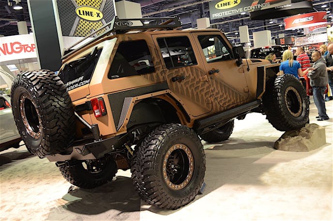 A walk by the Line-X booth at this year’s SEMA Show had us doing a double-take as we saw a desert-themed Jeep Wrangler playing mind tricks on us. What appeared to be ingrained tread marks on the body and doors of the vehicle were actually optical illusions, which showcased a new technique by the company to produce unique aesthetic results.