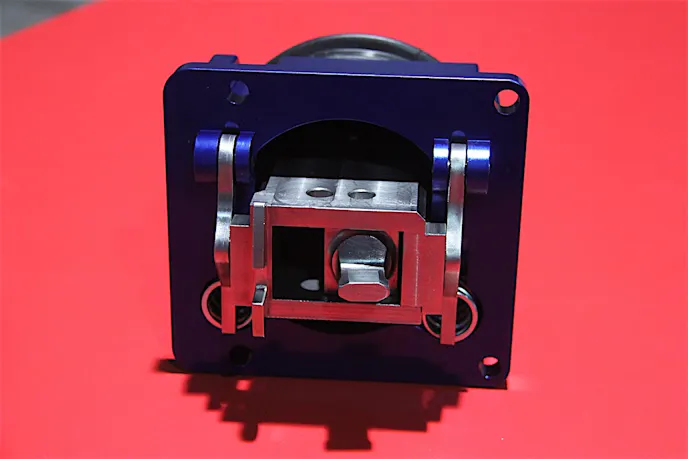 The shifter is comprised of 303 stainless steel for the stick, a CNC-machined aluminum base, and a spherical glass-filled nylon pivot ball.