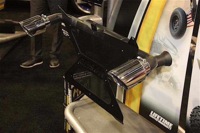 “This is a dual system that comes with four-inch stainless steel or black ceramic tips,” said Gibson. “You’ll also find this beauty plate on the back to complement the exhaust system. It’s 100-percent bolt-on and made right here in the USA.”