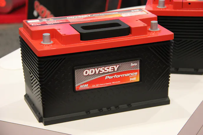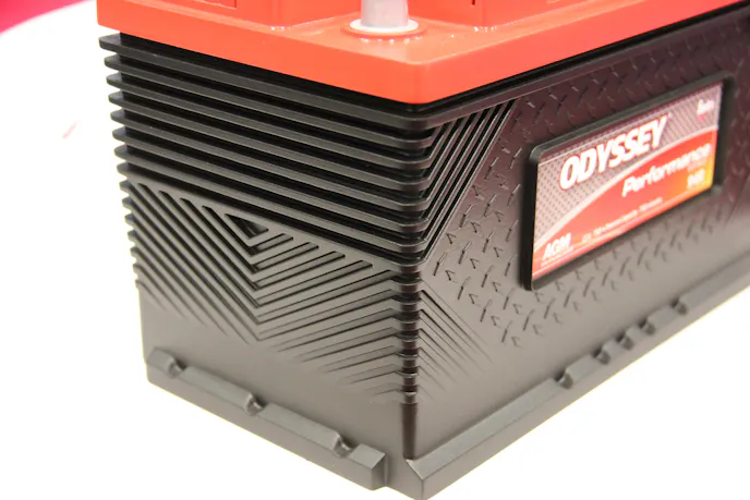 One of Odyssey’s newest products is the 94R, which is an AGM (absorbed glass mat) style battery. Traditional batteries, Woodruff shares, are built with free-flowing electrolyte. In an AGM, all of that electrolyte is stored in an absorbent glass mat pad in between the positive and negative plates. Woodruff describes it like a kitchen sink sponge, wherein you can put water in it and as long as you don’t oversaturate it, it won’t drip. The batteries are saturated to 92 percent of their capability, so if the battery is compromised in any way it won’t leak.