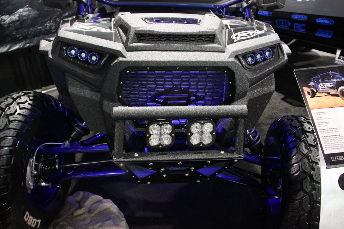 In case you haven’t noticed, UTVs have become very popular for racing, trail riding, ranching, and pretty much anything a small truck could be used for. When we were at the SEMA Show we saw this awesome RZR 1000 Turbo at the Sport Truck USA booth and had to stop and ask about it. The RZR was built to show off the RT Pro MX Series bumpers for 2014 and later RZR 1000.