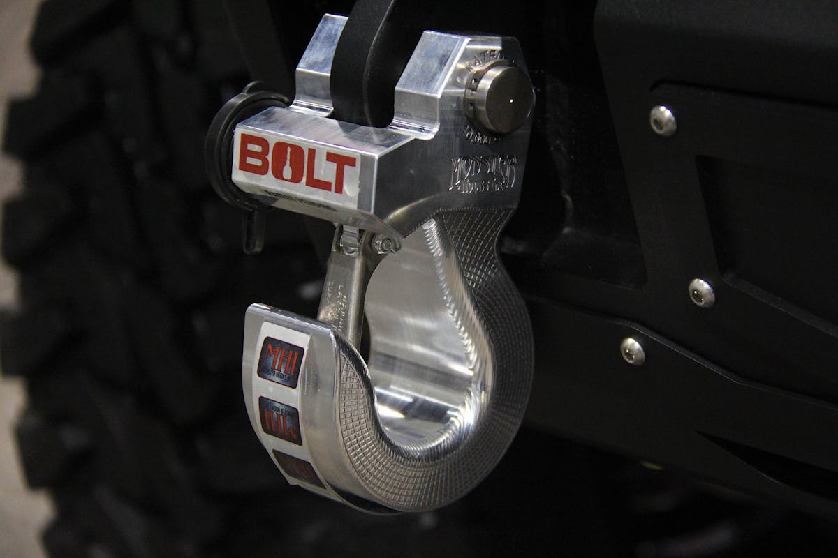 All told, BOLT installed about a dozen of its products onto the Jeep. “We’ve given the Wrangler a lot to work with,” said Buckles. “We have our hood lock, our receiver lock, padlocks, and a cable lock. The cable lock is a six-foot coiled cable that can loop around itself and anything you want secured.”