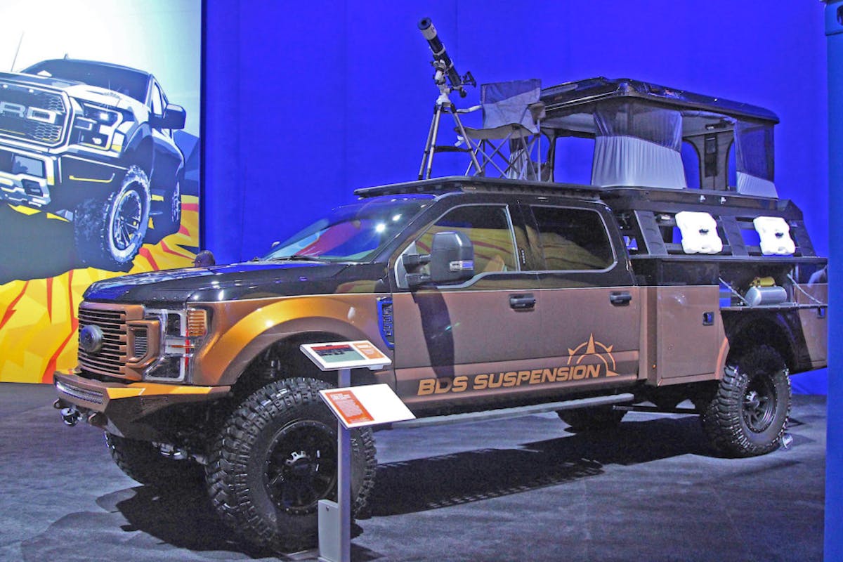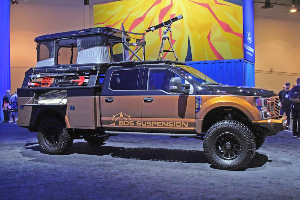 Overlanding builds took over the 2019 SEMA Show. Reflecting on the growing trend of enthusiasts who love to mix camping with off-roading, aftermarket companies wanted to show what they have cooking for the market segment. For their part, BDS Suspension had a build in the Ford booth. It was a 2020 F-350 called “Go Beyond.”