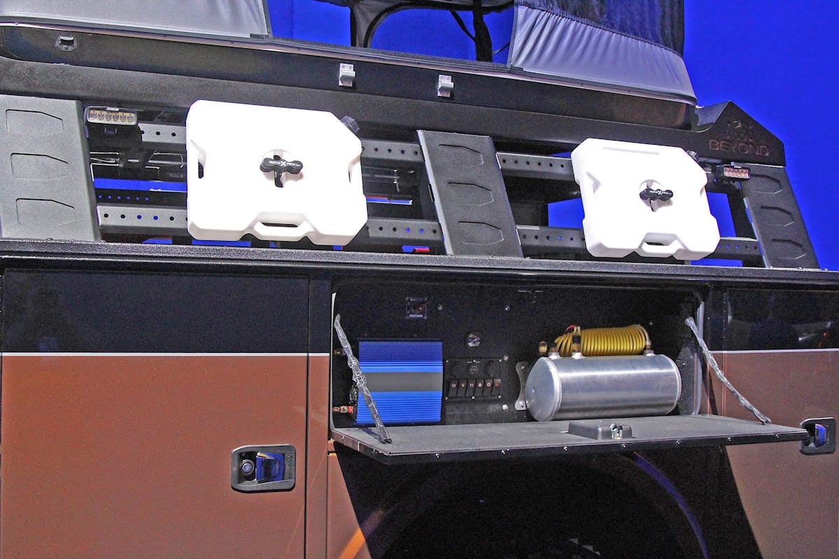 Within the service box, the BDS team inserted multiple storage boxes for gear and tools. “We used a Cargoglide CG-2200 XL that stores all the essentials,” said Reed. “It slides out a full eight feet and holds 2,200 pounds of stuff. The back also has drop slides from MSA for the Dometic fridge. We even fitted a full-size spare tire in there, as well as a gas grill.”