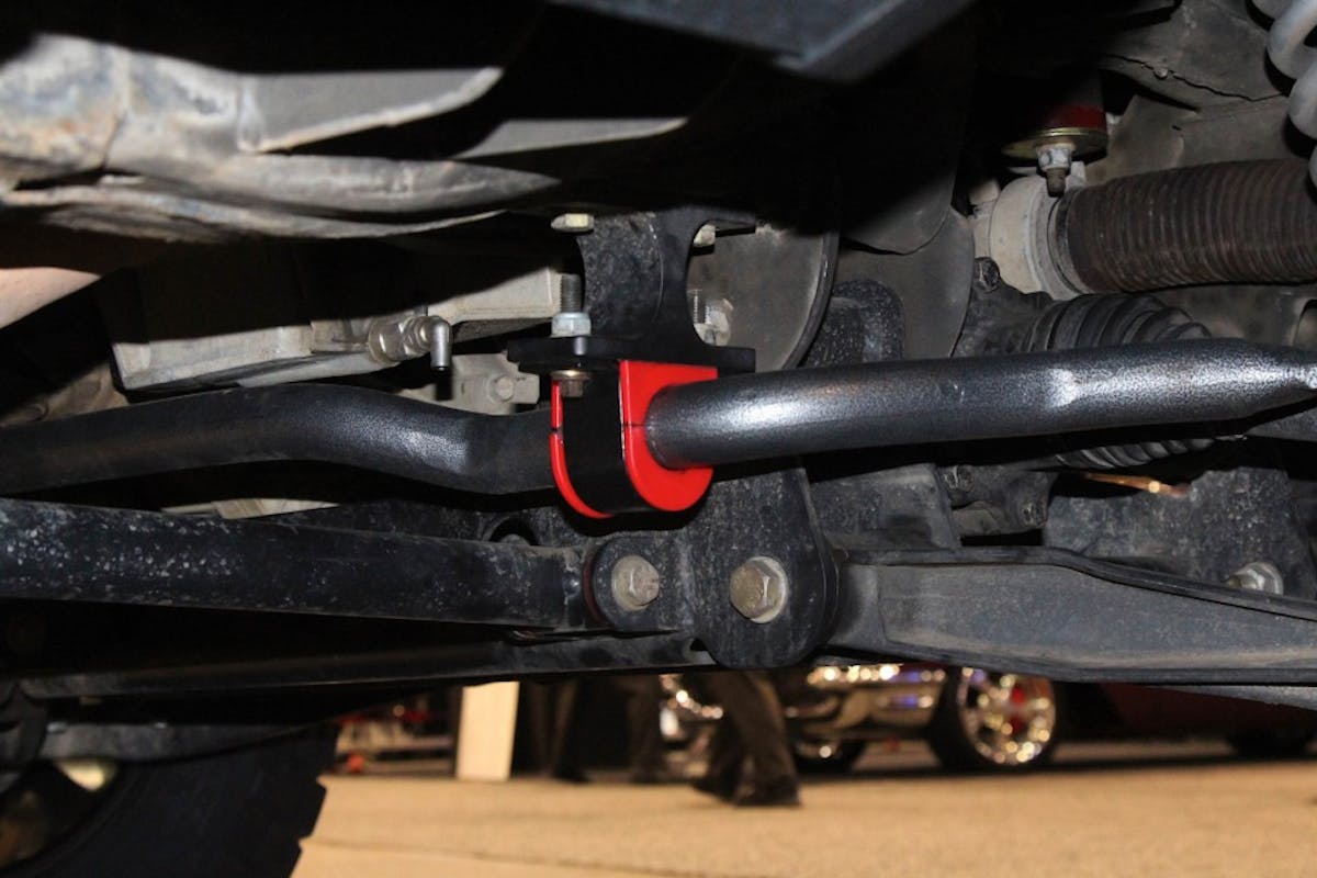 Take this modified 2011 Chevy Silverado, for instance, which we found sitting in the middle of Energy’s booth. Featuring Energy Suspension’s brand-new line of 2007-2014 GM 1500 4×4 master bushings, this pickup packs a product designed to replace every factory rubber component on the truck with polyurethane. These even include engine mounts for reduced powerplant motion, as well as transmission and differential mounts.