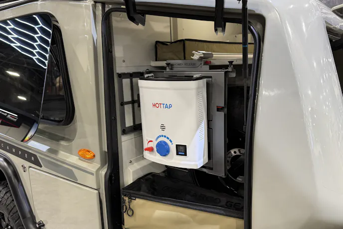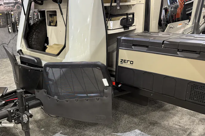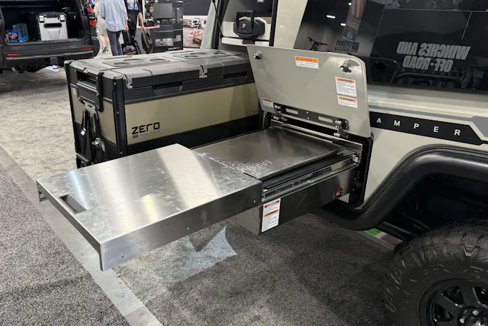 When you reach camp, an electric pushbutton lowers the tall rear hatch to form a hard floor and reveal the entry door. Deploy the matching rear tent, and you’ve created an above-ground living room that stays out of the dust.