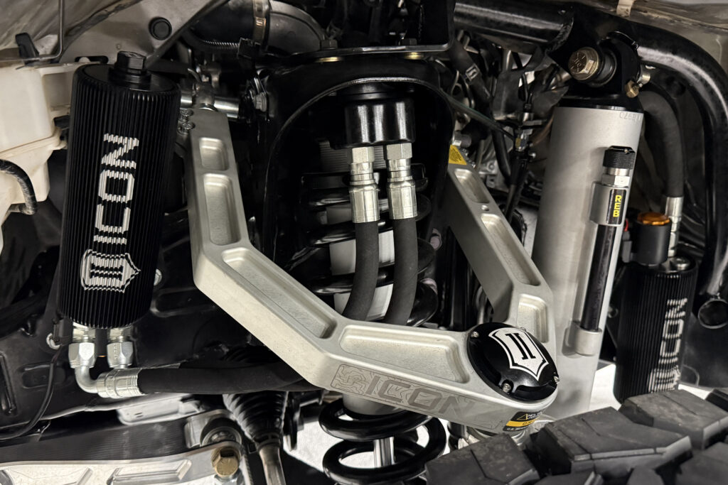 The centerpiece of the truck is ICON’s new 3.5-inch-over, long-travel suspension system. A set of billet aluminum upper control arms features the brand’s latest Delta Joint Pro with double-adjusters, offering fast and precise alignment capability. Down below, ICON developed a new style of lower control arm bushing designed specifically to eliminate the squeaks, pops, and binding common with uniballs or polyurethane alternatives. The result is a quiet, highly compliant front end that cycles an impressive 13 inches of wheel travel.
