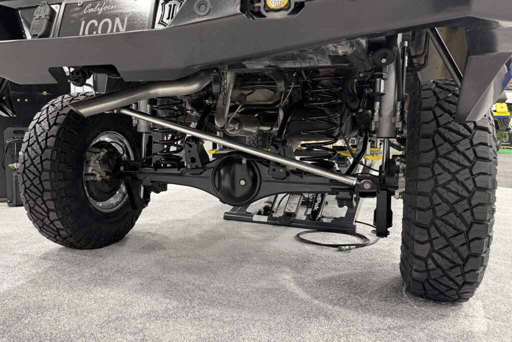 While the front showcases advanced long-travel hardware, the rear suspension is where ICON is preparing its next major release. The prototype package — internally dubbed the RXT Long Travel Kit — has been engineered specifically for this generation of Tundra and cycles an impressive 16.5 inches of wheel travel. The system features longer coil springs, revised upper links designed to clear the fuel tank, a bolt-on shock hoop, and extra-long dampers. Only minor trimming was required during development, and the production version is expected to offer around 14 inches of travel while remaining fully bolt-on.